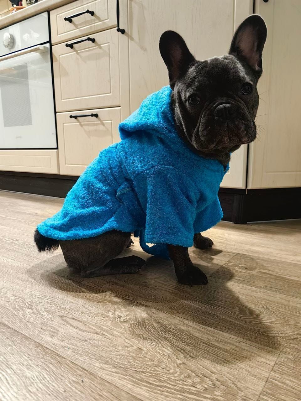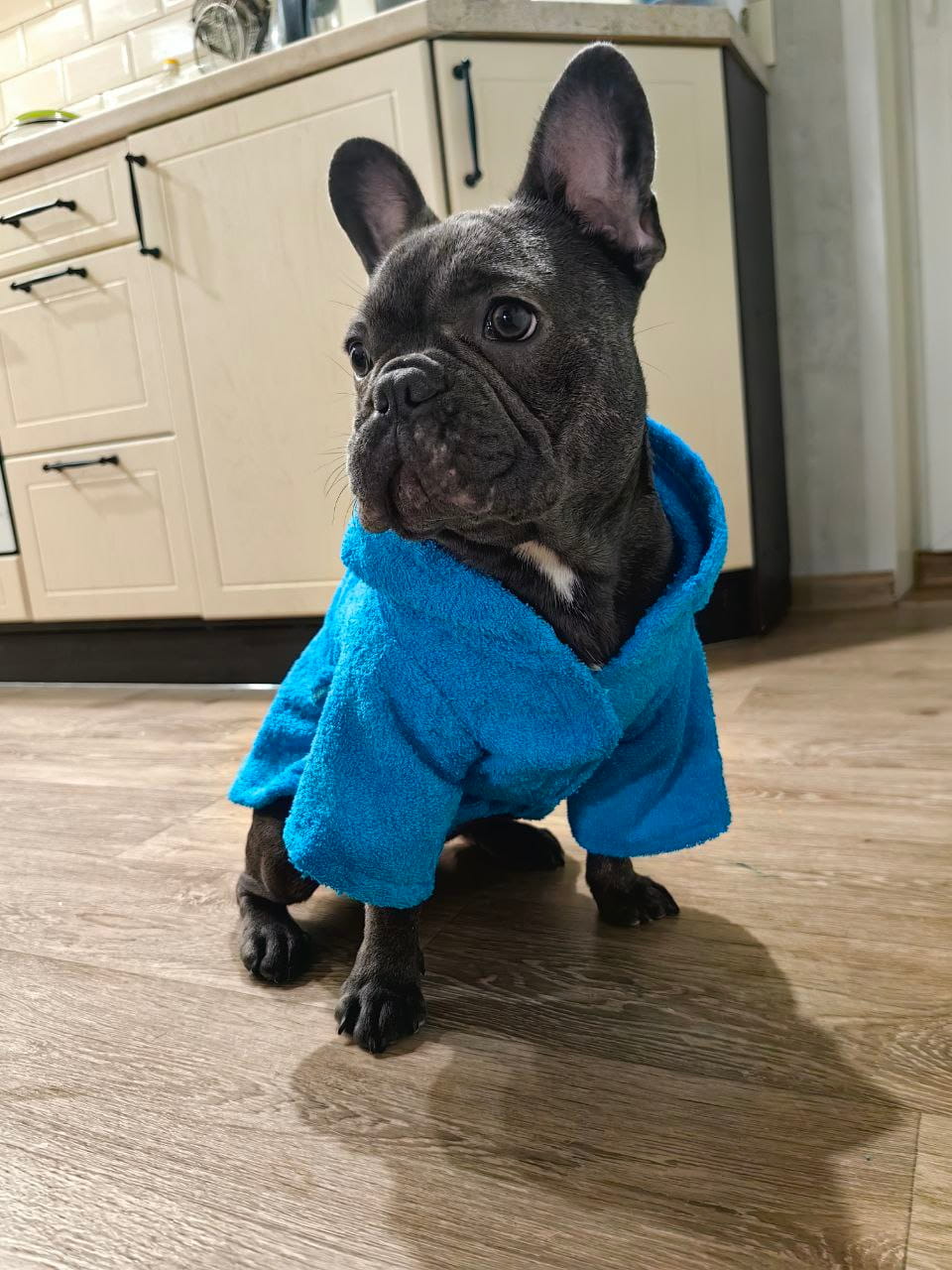 Материал: Натуральный хлопок (махровое полотно). Плотность 380-400 г/м² обеспечивает оптимальную впитываемость и воздухопроницаемость. Халат мягко согревает, не давая собаке замерзнуть, и при этом позволяет коже дышать.